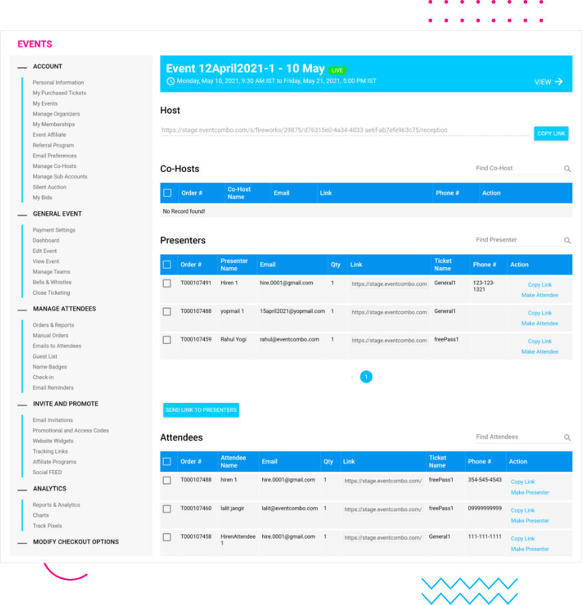 - Create discount codes, tracking links, affiliate programs, website widgets, private labeling and anything you can imagine for your complete event solution